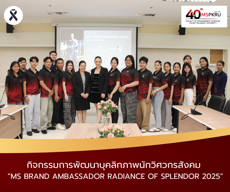 คณะวิทยาการจัดการ มหาวิทยาลัยราชภัฏภูเก็ต จัดโครงการพัฒนาศักยภาพนักศึกษาและทักษะในศตวรรษที่ 21 สู่การเป็นนวัตกรชุมชน กิจกรรมการพัฒนาบุคลิกภาพนักวิศวกรสังคม ภายใต้ชื่อ “MS BRAND AMBASSADOR RADIANCE OF SPLENDOR 2025” ประจำปีการศึกษา 2568 ในวันที่ 22 พฤศจิกายน 2568 ณ ห้องประชุม 19106 อาคารคณะวิทยาการจัดการ มหาวิทยาลัยราชภัฏภูเก็ต ได้รับเกียรติจาก อาจารย์ ดร.พิมพิกา พูลสวัสดิ์ รองคณบดีฝ่ายวิชาการ วิจัย และการประกันคุณภาพ กล่าวเปิดกิจกรรมในครั้งนี้