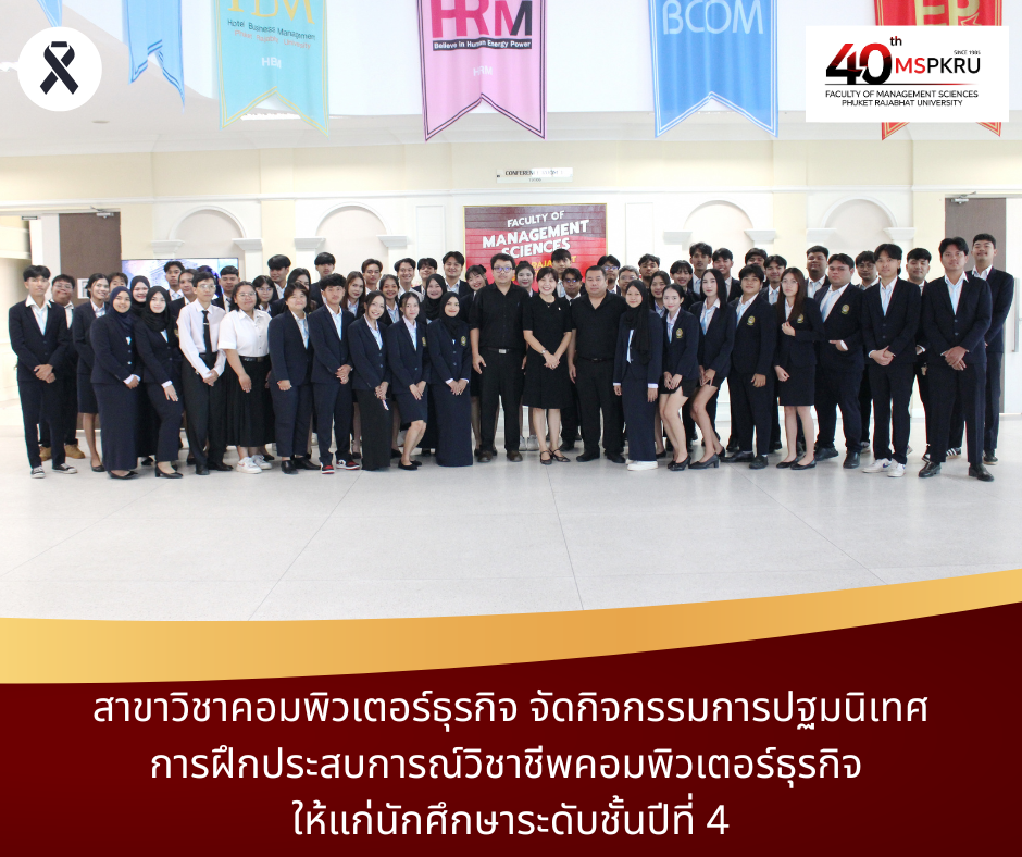 สาขาวิชาคอมพิวเตอร์ธุรกิจ คณะวิทยาการจัดการ มหาวิทยาลัยราชภัฏภูเก็ต จัดกิจกรรมการปฐมนิเทศการฝึกประสบการณ์วิชาชีพคอมพิวเตอร์ธุรกิจ ให้แก่นักศึกษาระดับชั้นปีที่ 4 ในวันที่ 10 พฤศจิกายน 2568 โดยมี ผศ.นงเยาว์ ประสมทอง คณบดีคณะวิทยาการจัดการ กล่าวเปิดกิจกรรม และการบรรยายพิเศษ เรื่อง การเตรียมความพร้อมก่อนออกฝึกประสบการณ์วิชาชีพ ในการนี้ มีประธานสาขาวิชา และคณาจารย์ประจำสาขาวิชา เข้าร่วมกิจกรรมดังกล่าว ณ ห้องประชุม 19206 คณะวิทยาการจัดการ มหาวิทยาลัยราชภัฏภูเก็ต