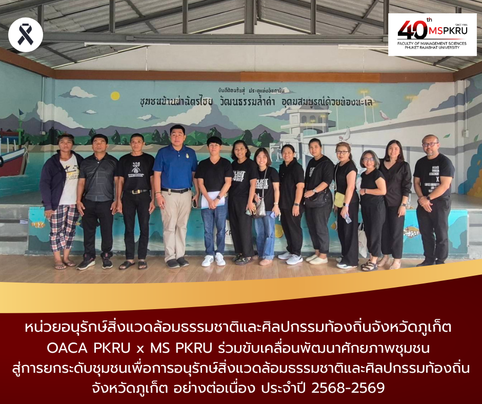 OACA PKRU x MSหน่วยอนุรักษ์สิ่งแวดล้อมธรรมชาติและศิลปกรรมท้องถิ่นจังหวัดภู04/12/2025โครงการส่งเสริมและพัฒนาอาหารพื้นถิ่นภูเก็ตแบบบูรณาการสู่การท่องเที่ยว03/11/2025เสวนาทิศทางการยกระดับอาหารพื้นถิ่นภูเก็ตสู่ฟิวชั่นฟู๊ด โครงการส่งเสริมและพัฒนาอา10/10/2025