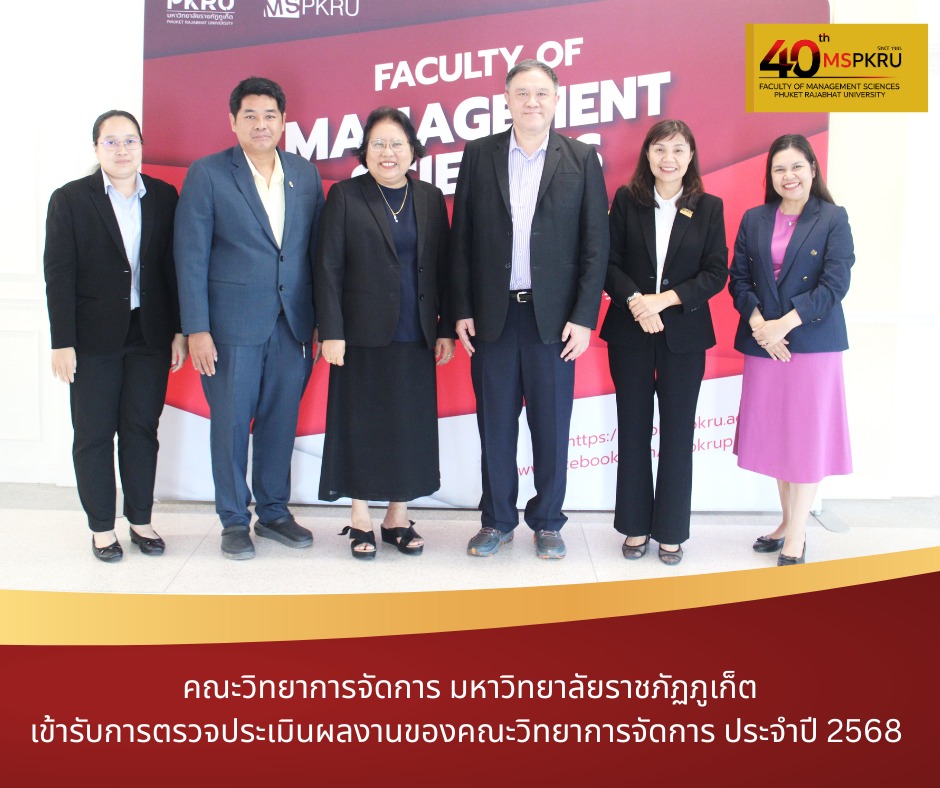 คณะวิทยาการจัดการ มหาวิทยาลัยราชภัฏภูเก็ต เข้ารับการตรวจประเมินผลงานของคณะวิทยาการจัดการ ประจำปี 2568 ในวันที่ 14 ตุลาคม 2568 นำโดย ผศ.นงเยาว์ ประสมทอง คณบดีคณะวิทยาการจัดการ พร้อมด้วย คณะผู้บริหาร รองคณบดี หัวหน้าสำนักงานคณบดี ตลอดจน บุคลากร เข้ารับการตรวจประเมิน พร้อมนำเสนอและให้สัมภาษณ์ข้อมูลผลการดำเนินงานตามพันธกิจของหน่วยงาน ต่อคณะกรรมการติดตาม ตรวจสอบ และประเมินผลงานของคณะวิทยาการจัดการ นำโดย ศ.ดร.วรเวศม์ สุวรรณระดา คณะกรรมการฯ